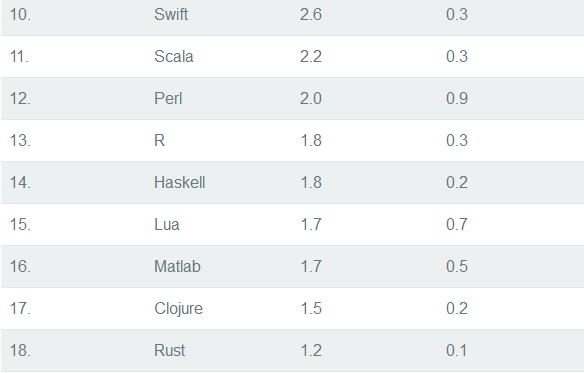 在埃里克的排名中,Go是最大的赢家,16.4%。由于Erik基于Google查询的方法,似乎围绕Go的热门话题,让人们在博客中明确地表示,如果他们想要使用这种语言,那么就需要花一点时间来生成在GitHub上有效编写的项目。