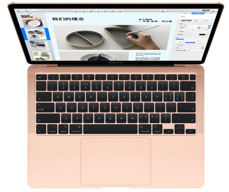 本次更新的另一大新品是 MacBook Air 2020,外观上与前代区别不大,最大的变化则是配备了和 16 英寸 MacBook Pro 一样的剪刀式键盘,触控板面积增大 20%,键程 1mm。同时 Touch ID 也变成了磨砂表面并独立放置;依然配有两个雷雳 3 接口,和 3.5mm 耳麦合一接口。