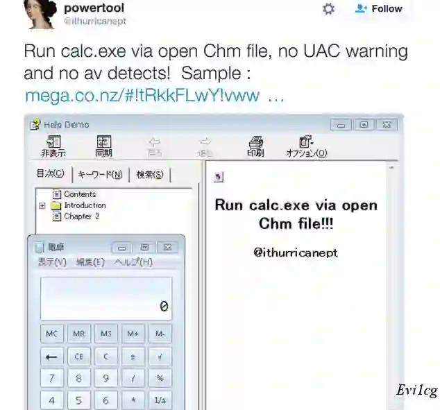 14年的时候@ithurricanept 在twitter上发了一个demo,通过CHM运行计算器:
