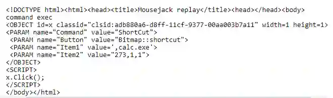 经过多次测试,成功将以上命令写入chm,其Html代码为: