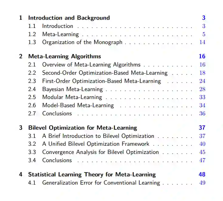 这篇综述专著通过涵盖原理、算法、理论和工程应用提供了元学习的介绍。在本节中,我们首先通过与传统机器学习和多任务学习的对比,对元学习进行首次阐述。本章以对各论其余部分组织的描述结束。