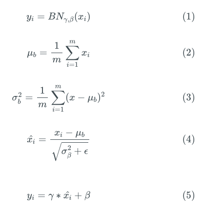 等式5是关键部分。γ和β是所谓的批归一化层的参数,等式5的输出均值为β,标准差为γ。从效果上说,批归一化层有助于优化算法控制网络层输出的均值和方差。