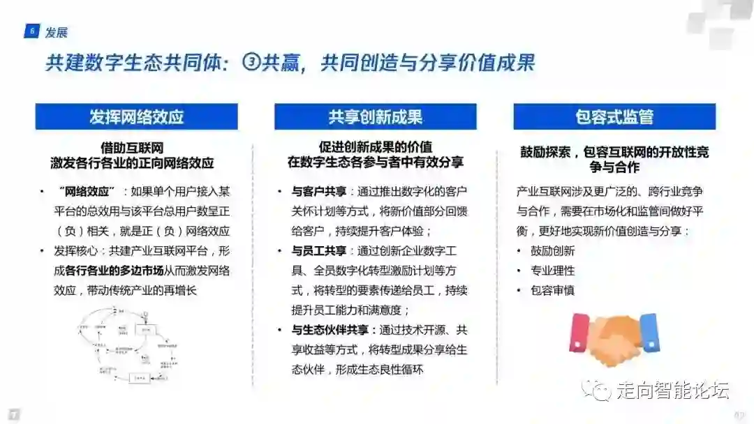 在发展产业互联网的道路上,理念和思维模式的刷新需要走在前列。报告提出了共建数字生态共同体的倡议:一是共生,数字世界与物理世界不是孤立、而是协同发展;二是共创,要能跨界、敢跨界,积极打破传统产业间、以及不同科技的边界混合创新;三是共赢,要鼓励共同创造与分享价值成果,推动技术开源、能力开放、收益共享等等。相信在这一共同体愿景的指引下,中国产业能够更快、更好实现转型。