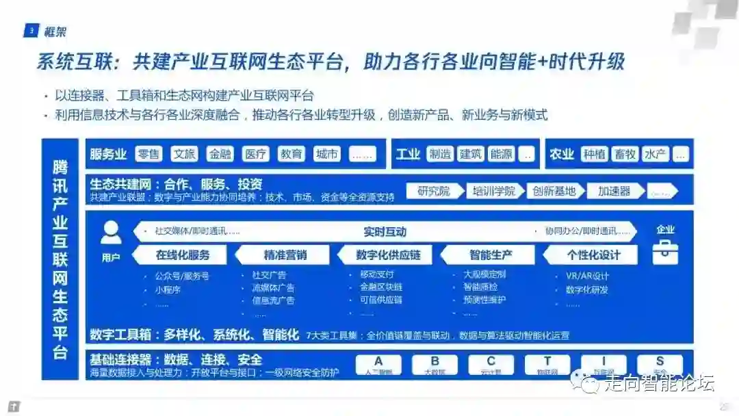 近日,在2019腾讯全球数字生态大会新闻发布会上,腾讯云联合腾讯研究院,共同发布了行业重磅报告:《产业互联网——构建智能+时代数字生态新图景》。报告首次阐述了产业互联网的战略框架和实践方法论。报告指出,产业互联网的实现,需要跨界共建数字生态共同体,形成新价值网络,需要传统行业发挥主导作用,利用互联网工具,构建适合自身特点的新型数字生态网络,获得新动能、实现新价值。本文来自:腾讯研究院,版权归原机构所有,由《走向智能论坛》微信公号推荐阅读。