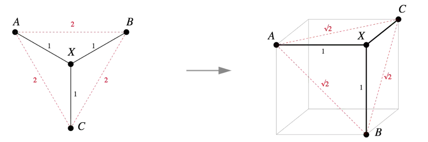 事实上,图 1 中的树就是一个标准示例,表明并非所有度量空间都可以等距离地嵌入到 R^n 中。因为 d(A,B)=d(A,X)+d(X,B),所以在任意嵌入中 A、X 和 B 都是共线的。基于同一逻辑,A、X 和 C 也是共线的。但这就意味着 B=C,这是矛盾的。