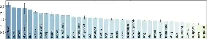 图 7 展示了这一实验的结果。结果表明每个依存关系的平均嵌入距离的变化范围很大:从大约 1.2(compound : prt, advcl)到 2.5(mwe, parataxis, auxpass)。研究这些系统性差异的含义是很有趣的。或许也许使用加权的树,BERT 的句法表征有优于普通依存语法的其它定量方面。