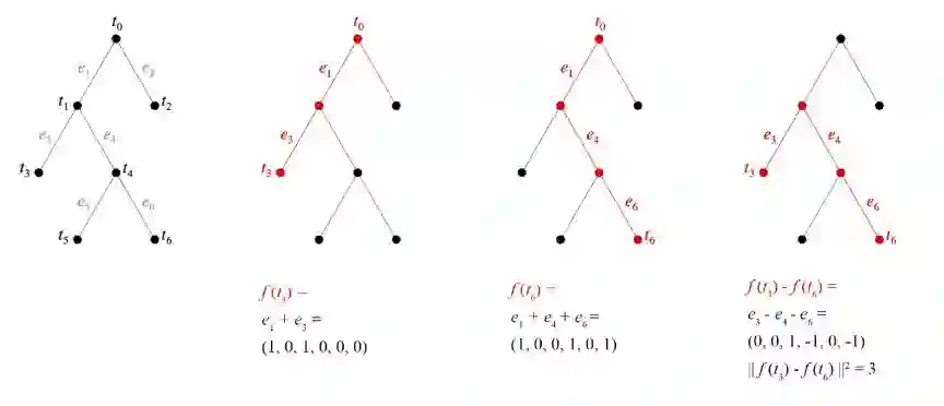 图 4:左:将基向量分配给边。中:两个示例嵌入。右:平方的距离等于树距离。