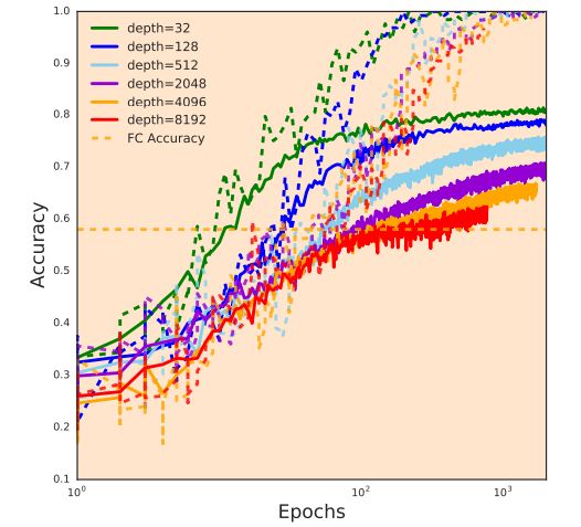 图 3. 在 CIFAR-10 上,使用正交核进行不同深度初始化的 CNN 的测试曲线(实线)和训练曲线(虚线)。这些曲线(除了早停的 8192)的训练准确率都达到了 100%,而泛化性能随着深度增加逐渐下降,很可能是因为空间非均匀模式的衰减。图 1 的 Delta-Orthogonal 初始化解决了这一性能下降问题。
