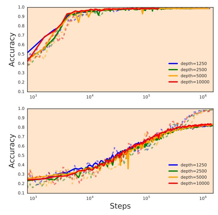 图 1. 在不使用批归一化或残差连接而仅使用 Delta-Orthogonal 初始化(具备关键权重、偏差方差和恰当的非线性函数)的情况下,非常深的 CNN 网络架构是可以训练的。图为在 MNIST(上)和 CIFAR- 10(下)上模型深度为 1,250、2,500、5,000 和 10, 000 时的测试曲线(实线)和训练曲线(虚线)。