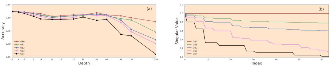 图 4. 随深度变化的测试性能与广义平均算子(A_v*)的奇异值分布(SVD)相关。(a)在关键线上的初始化,研究者检查了使用不同深度和不同非均匀方差向量的高斯初始化的 CNN 的测试准确率。研究者将来自 delta 函数(红色)的方差向量改变为均匀分布的方差向量(黑色)。从深度为 35 开始,测试准确率曲线也从红色变成了黑色。(b)所选方差向量的(A_v*)SVD。x 轴表示奇异值的索引,每个方差向量共有 64 个奇异值(每个有 64 个副本)。