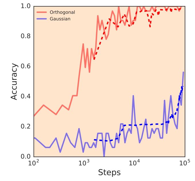图 5. 正交初始化带来 CNN 的更快速训练。使用具备同样权重方差的正交初始化(红色)和高斯初始化(黑色)对 4000 层 CNN 进行训练,实线为训练曲线,虚线为测试曲线。