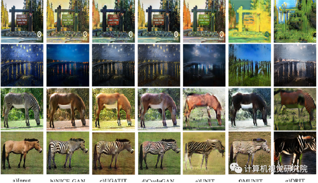 转换效果图。从上到下依次为:狗<—>猫,冬天<—>夏天,普通照片<—>梵高作品,斑马<—>综马
