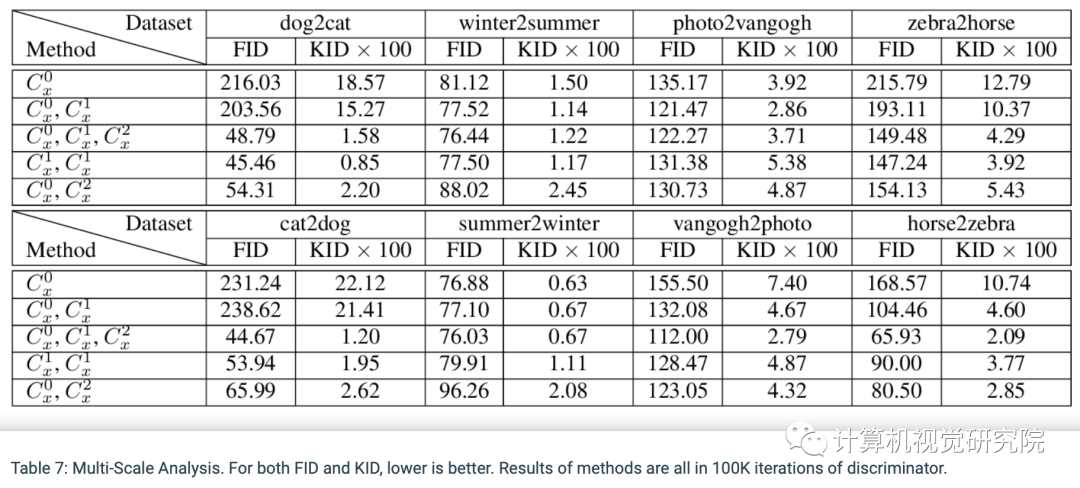 在四个流行的基准上的FID和KID指标。NICE-GAN的性能优于最新方法
