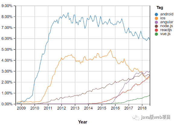6. Stackoverflows这些图表的下降趋势实际上是由于人们的较低兴趣,或者只是答案已经存在且不再需要被问及。向上趋势肯定表明增长,但下降趋势......可能只是成熟和时间的标志,不一定是人气下降。