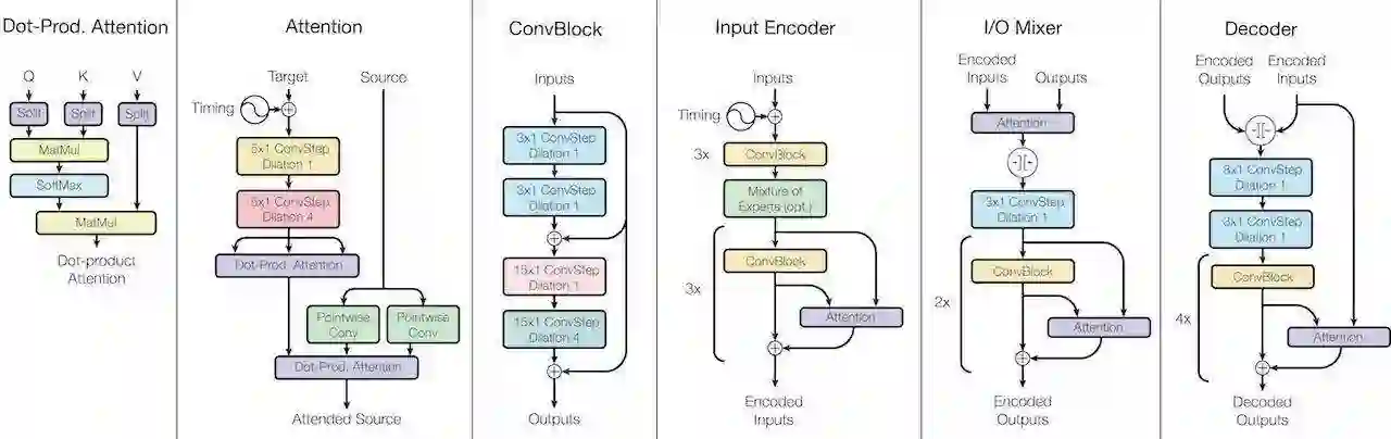 注意力模块:关键是定时信号,基于位置来对内容的注意力进行集中;拥有源张量和目标张量两个输入。 卷积模块:用于发现局部模式,并将其泛化;内含线性整流函数ReLU、SepConv和归一层三个组件。