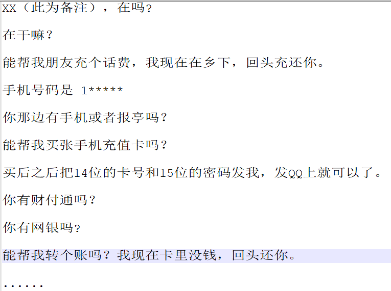 那时候网银不普及,QQ只有财付通,支付宝也很少人使用,还是现金支付的时代,所以QQ诈骗主要骗话费和手机充值卡,那时候手机号码还不用实名制。