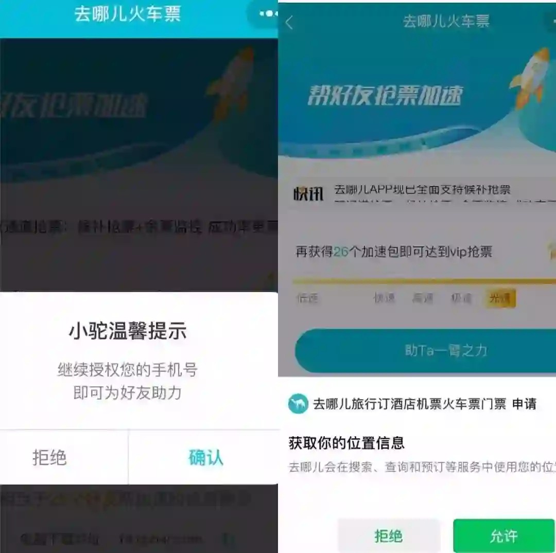 在去哪儿上助力朋友抢票时,系统会获取位置和手机号等信息