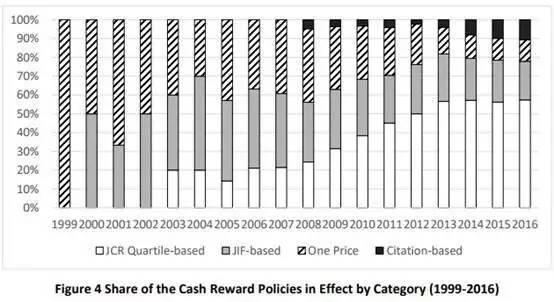 可以看到,在1999年,高校还都是实行One Price政策只要发SCI就给一样钱;但到了2000年,一半高校就开始看期刊影响因子了;之后对于期刊分区的重要性越发看重,现在超过半数高校的科研奖励与期刊JCR分区挂钩。而引用量这个指标对于科研新人来说,实在太不友好,很多高校作为补充政策适用。