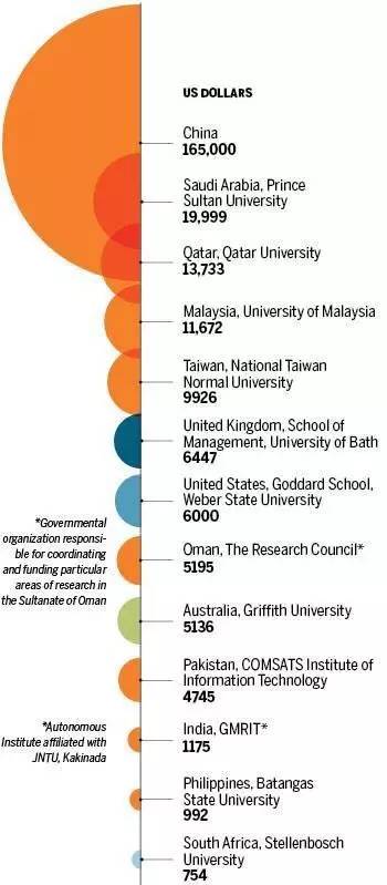 中国高校对于科研奖励十分慷慨,但在其他国家也有着类似的制度。对各国科研奖励的金额进行统计发现,排在中国之后的是两个海湾国家,沙特阿拉伯和卡塔尔。