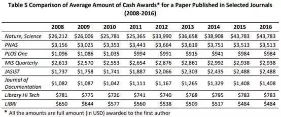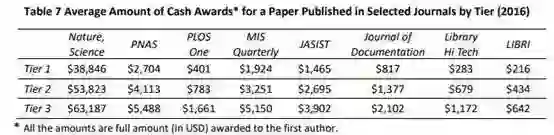 欧美国家也是如此,在美国的米勒商学院有一份包含100多本期刊的名单,在上面发表论文的作者每人都可以获得2000美元的奖励。这些奖励不仅可以兑换为现金,也可用于支付学术活动的花费,该机构对作者获得奖励的金额没有做出限制。