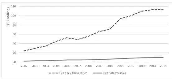 从上图可以看出,985和211院校虽然在数量上只有第三等的1/10,但却得到了大量的财政预算。从2002年到2015年,985和211院校的年均预算从2386万美元增加到1.135亿美元,而普通大学的平均预算仅仅从89万美元增加到927万美元。2015年112所重点高校获得的研究经费几乎是1124所普通高校的10倍。