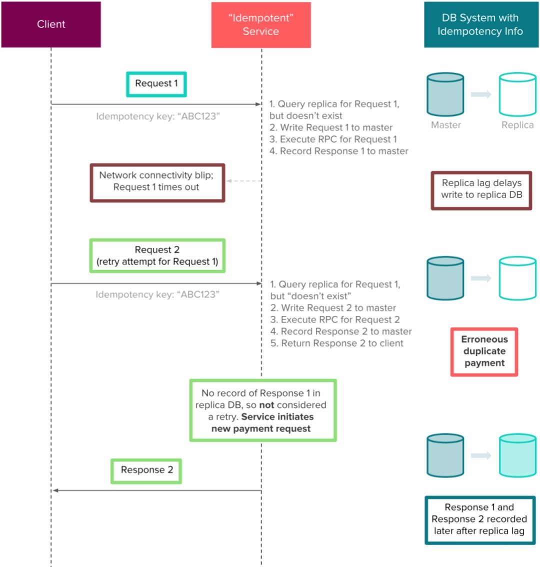 例如,假设支付服务将其幂等信息存储在从库中。客户端向支付服务提交付款请求,该请求最终成功,但客户端由于网络问题而未收到响应。虽然当前存储在服务主库中的响应最终将最终写入从库,但是,由于有同步延迟,客户端可能会进行重试,由于同步延迟,服务可能会错误地再次执行付款,从而导致重复付款。下面的例子说明了仅仅几秒钟的复制延迟可能会对Airbnb造成重大财务影响。