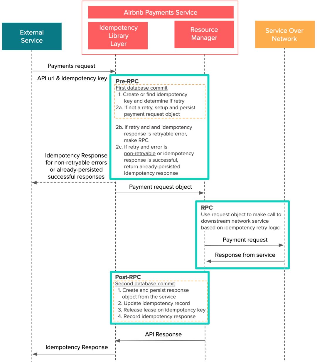 public <R extends Object, S extends Object, A extends IdempotencyRequest> Response process(String idempotencyKey,UriInfo uriInfo,SetupExecutable<A> preRpcExecutable, // Pre-RPC lambdaProcessExecutable<R, A> rpcExecutable, // RPC lambdaPostProcessExecutable<R, S> postRpcExecutable) // Post-RPC lambdathrows YourCustomException {try {// Find previous request (for retries), otherwise createIdempotencyRequest idempotencyRequest = createOrFindRequest(idempotencyKey, apiUri);Optional<Response> responseOptional = findIdempotencyResponse(idempotencyRequest);// Return the response for any deterministic end-states, such as// non-retryable errors and previously successful responsesif (responseOptional.isPresent()) {return responseOptional.get();}boolean isRetry = idempotencyRequest.isRetry();A requestObject = null;// STEP 1: Pre-RPC phase:// Typically used to create transaction and related sub-entities// Skipped if request is a retryif(!isRetry) {// Before a request is made to the external service, we record// the request and idempotency commit in a single DB transactionrequestObject =dbTransactionManager.execute(tc -> {final A preRpcResource = preRpcExecutable.execute();updateIdempotencyResource(idempotencyKey, preRpcResource);return preRpcResource;});} else {requestObject = findRequestObject(idempotencyRequest);}// STEP 2: RPC phase:// One or more network calls to the service. May include// additional idempotency logic in the case of a retry// Note: NO database transactions should exist in this executableR rpcResponse = rpcExecutable.execute(isRetry, requestObject);// STEP 3: Post-RPC phase:// Response is recorded and idempotency information is updated,// such as releasing the lease on the idempotency key. Again,// all in one single DB transactionS response = dbTransactionManager.execute(tc -> {final S postRpcResponse = postRpcExecutable.execute(isRetry, rpcResponse);updateIdempotencyResource(idempotencyKey, postRpcResponse);return postRpcResponse;});return serializeResponse(response);} catch (Throwable exception) {// If CustomException, return error code and response based on// ‘retryable’ or ‘non-retryable’. Otherwise, classify as ‘retryable’// and return a 500.}}