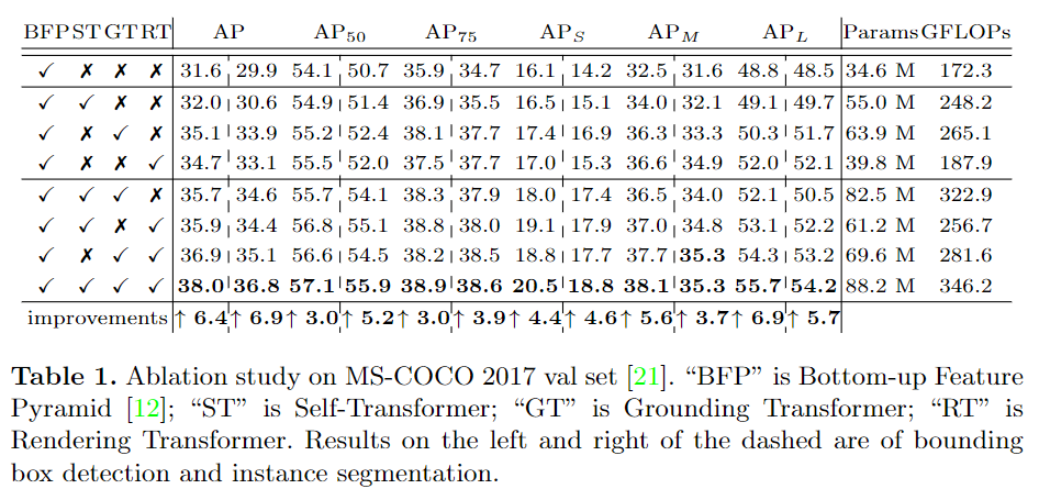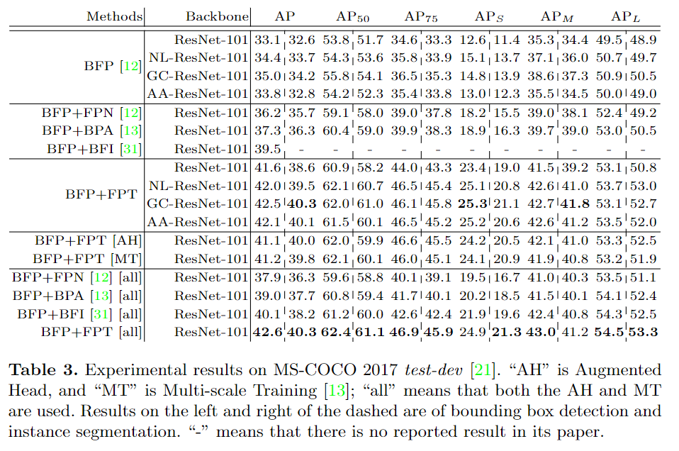 大量的实验表明,FPT可以极大地改善传统的检测/分割网络:1)在MS-COCO test-dev数据集上,用于框检测的百分比增益为8.5%,用于遮罩实例的mask AP值增益为6.0%;2)对于语义分割,分别在Cityscapes和PASCAL VOC 2012 测试集上的增益分别为1.6%和1.2%mIoU;在ADE20K 和LIP 验证集上的增益分别为1.7%和2.0%mIoU。