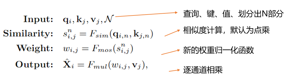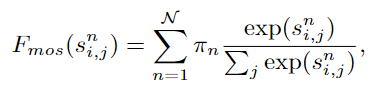 自变换器(Self-Transformer,ST)的目的是在同一张特征图上捕获共同发生的对象特征。如图3(a)所示,ST是一种修改后的非局部non-local交互,输出的特征图与其输入特征图的尺度相同。与其他方法区别在于,作者部署了Mixture of Softmaxes(MoS)作为归一化函数,事实证明它比标准的Softmax在图像上更有效。具体来说,首先将查询q和键k划分为N个部分。然后,使用Fsim计算每对图像的相似度分数。基于MoS的归一化函数Fmos表达式如下: