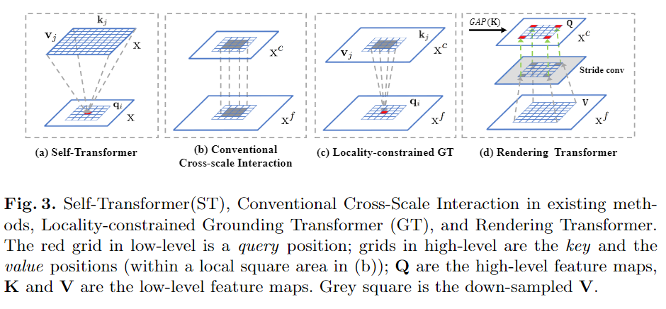 在本文的实现中,RT不是按像素进行的,而是按整个特征图进行的。具体来说,高层特征图定义为Q,低层特征图定义为K和V,为了突出渲染目标,Q和K之间的交互是以通道导向的关注方式进行的,K首先通过全局平均池化(GAP)计算出Q的权重w。然后,加权后的Q(即Qatt)通过3×3卷积进行优化,V通过3×3卷积与步长来缩小特征规模(图3(d)中的灰色方块)。最后,将优化后的Qatt和下采样的V(即Vdow)相加,再经过一次3×3卷积进行细化处理。