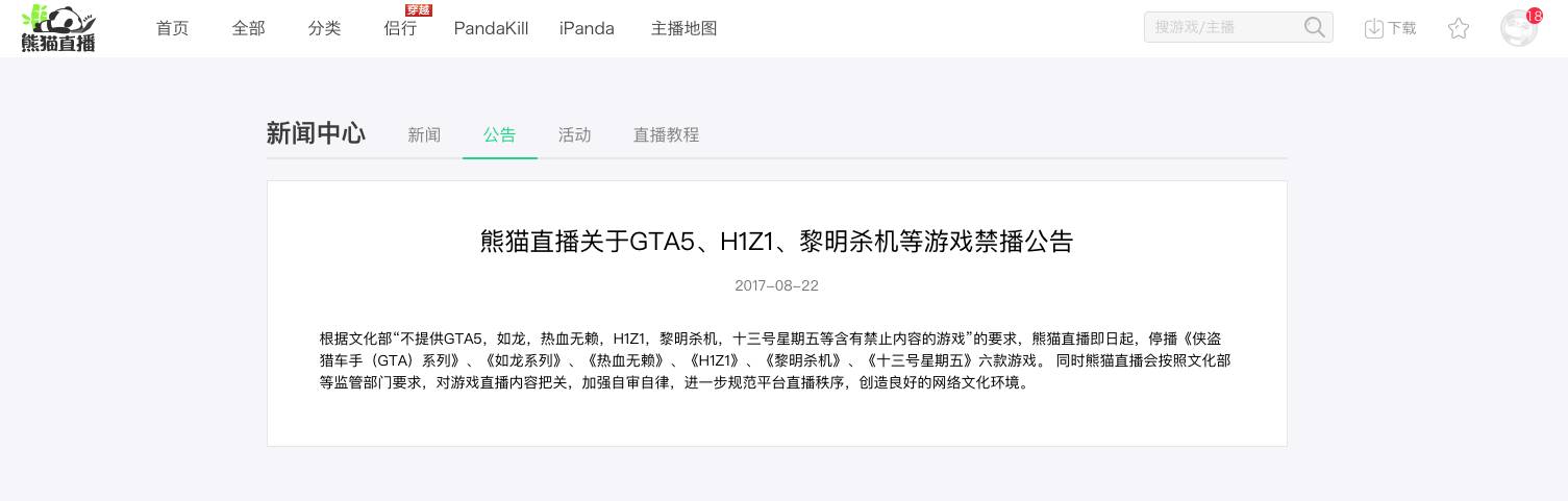 昨,熊猫 TV 发布了一条《关于 GTA5、H1Z1、黎明杀机等游戏禁播》的公告,明确指出将从即日起停播 GTA5、H1Z1 等六款游戏的直播。