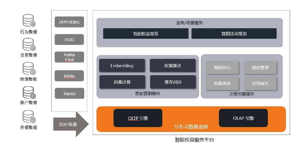 如图2所示,在实际智能权益服务平台项目中,将用户的行为数据、实时的交易数据以及地理数据、账户数据和外部数据一起通过“流批一体”汇入HTAP分布式数据库,来支撑智能权益推荐与营销活动策划等实时应用。