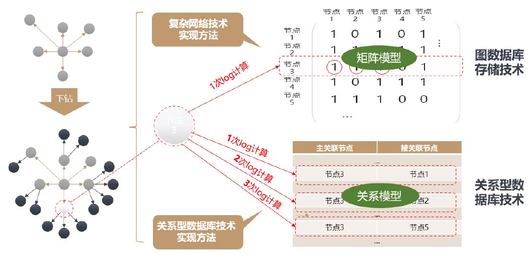 如图4所示,在查找与节点A相关的节点B的属性信息时,使用复杂网络只需进行一次log计算即可获取结果,而如果要通过传统数据库的关系型模型实现,则需要通过至少N-1次jion才能得到结果(N=A节点的一度关联个数),可以发现,如果进行大量此类结算,使用复杂网络的矩阵模型在同等配置情况下将会节省大量查询时间。