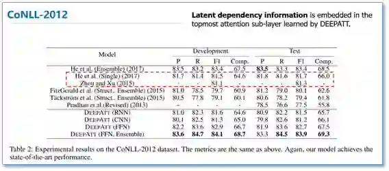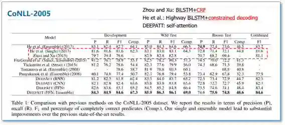 该模型在CoNLL-2005和CoNll-2012的SRL数据集上都取得了先进结果。我们知道序列标注问题中,标签之间是有依赖关系的,比如标签I,应该是出现在标签B之后,而不应该出现在O之后。目前主流的序列标注模型是BiLSTM-CRF模型,利用CRF进行全局标签优化。在对比实验中,He et al和Zhou and Xu的模型分别使用了CRF和constrained decoding来处理这个问题。可以看到本论文仅使用self-attention,作者认为在模型的顶层的attention层能够学习到标签潜在的依赖信息。