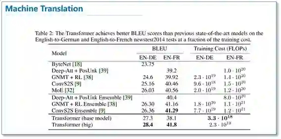 最后我们看一下实验结果,在WMT2014的英德和英法机器翻译任务上,都取得了先进的结果,且训练速度优于其他模型。