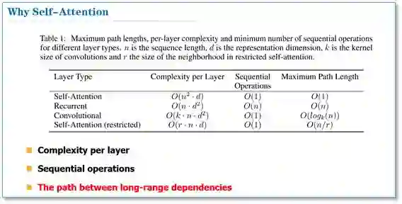 对于使用自注意力机制的原因,论文中提到主要从三个方面考虑(每一层的复杂度,是否可以并行,长距离依赖学习),并给出了和RNN,CNN计算复杂度的比较。可以看到,如果输入序列n小于表示维度d的话,每一层的时间复杂度self-attention是比较有优势的。当n比较大时,作者也给出了一种解决方案self-attention(restricted)即每个词不是和所有词计算attention,而是只与限制的r个词去计算attention。在并行方面,多头attention和CNN一样不依赖于前一时刻的计算,可以很好的并行,优于RNN。在长距离依赖上,由于self-attention是每个词和所有词都要计算attention,所以不管他们中间有多长距离,最大的路径长度也都只是1。可以捕获长距离依赖关系。