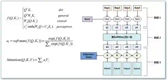 在计算attention时主要分为三步,第一步是将query和每个key进行相似度计算得到权重,常用的相似度函数有点积,拼接,感知机等;然后第二步一般是使用一个softmax函数对这些权重进行归一化;最后将权重和相应的键值value进行加权求和得到最后的attention。目前在NLP研究中,key和value常常都是同一个,即key=value。