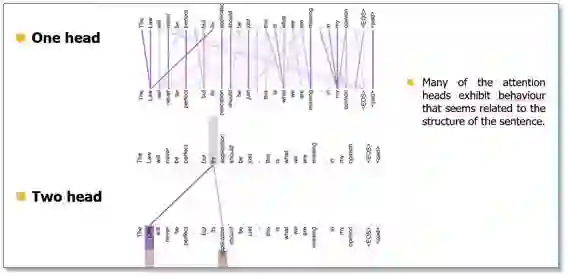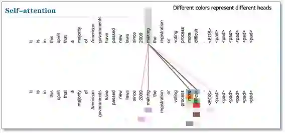 最后我们看一下attention可视化的效果(这里不同颜色代表attention不同头的结果,颜色越深attention值越大)。可以看到self-attention在这里可以学习到句子内部长距离依赖"making…….more difficult"这个短语。在两个头和单头的比较中,可以看到单头"its"这个词只能学习到"law"的依赖关系,而两个头"its"不仅学习到了"law"还学习到了"application"依赖关系。多头能够从不同的表示子空间里学习相关信息。