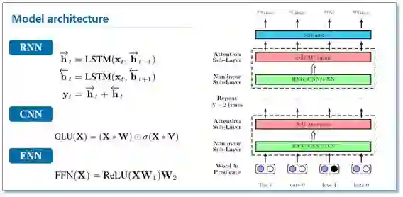 这篇论文来自AAAI2018,厦门大学Tan等人的工作。他们将self-attention应用到了语义角色标注任务(SRL)上,并取得了先进的结果。这篇论文中,作者将SRL作为一个序列标注问题,使用BIO标签进行标注。然后提出使用深度注意力网络(Deep Attentional Neural Network)进行标注,网络结构如下。在每一个网络块中,有一个RNN/CNN/FNN子层和一个self-attention子层组成。最后直接利用softmax当成标签分类进行序列标注。