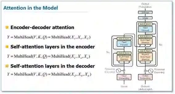 那么在整个模型中,是如何使用attention的呢?如下图,首先在编码器到解码器的地方使用了多头attention进行连接,K,V,Q分别是编码器的层输出(这里K=V)和解码器中都头attention的输入。其实就和主流的机器翻译模型中的attention一样,利用解码器和编码器attention来进行翻译对齐。然后在编码器和解码器中都使用了多头自注意力self-attention来学习文本的表示。Self-attention即K=V=Q,例如输入一个句子,那么里面的每个词都要和该句子中的所有词进行attention计算。目的是学习句子内部的词依赖关系,捕获句子的内部结构。