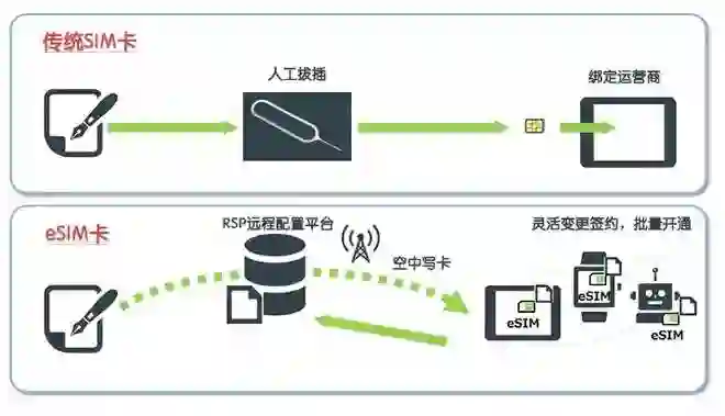eSIM简单来说,就是把手机卡从需要拔插的实体SIM卡变为嵌入式,芯片直接集成到内部主板上,用户通过相关APP开通套餐后,即可进行通话和上网。换运营商也无需去营业厅拿新卡,直接网上办理就行。