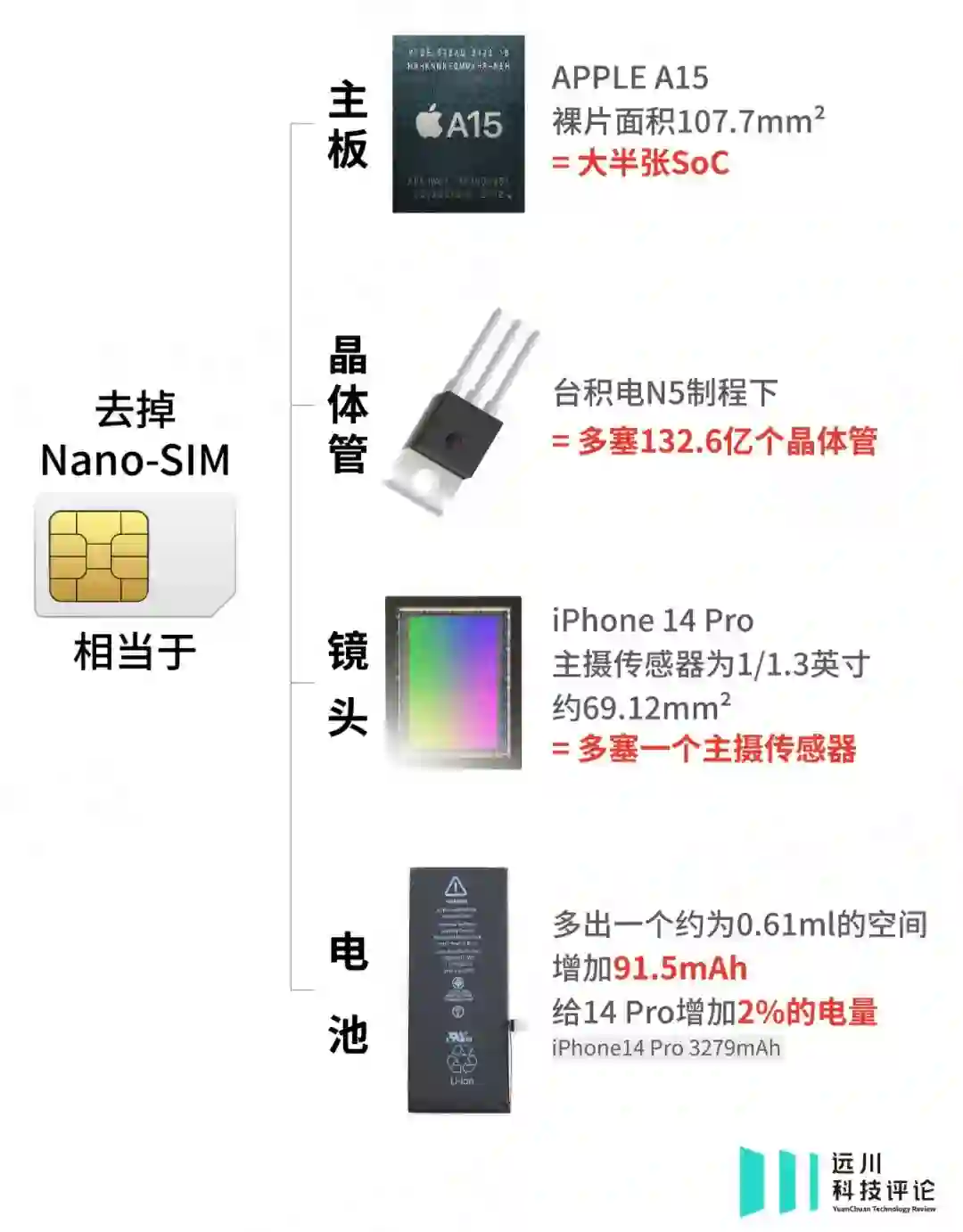 过去苹果采用的SIM卡,是如今厂商常用的微型SIM卡nano-SIM,尺寸为12mm x 9mm,面积大致为108mm²,大概是一个人的指甲盖大小。而eSIM卡尺寸为6mm x 5.0mm,面积大致为30mm²。