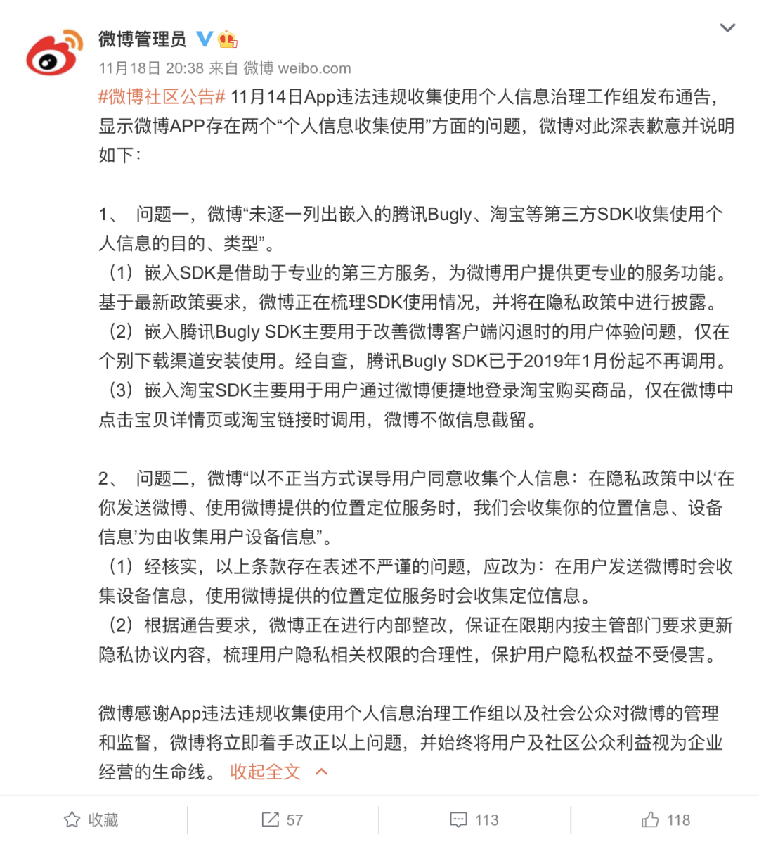 36氪获悉,新浪微博发布社区公告称,11月14日App违法违规收集使用个人信息治理工作组发布通告,显示微博App存在两个“个人信息收集使用”方面的问题,微博对此深表歉意。根据通告要求,微博正在进行内部整改,保证在限期内按主管部门要求更新隐私协议内容,梳理用户隐私相关权限的合理性,保护用户隐私权益不受侵害。