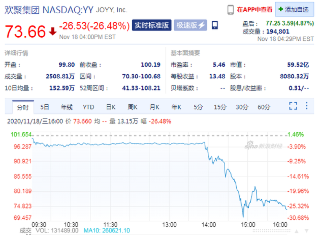 北京时间 11 月 19 日凌晨消息,周三收盘,欢聚集团股价暴跌 26.48%,报 73.66 美元。今天知名做空机构浑水公司做空中概股欢聚集团,浑水称调查显示 YY 直播有大约 90% 都是伪造数据。