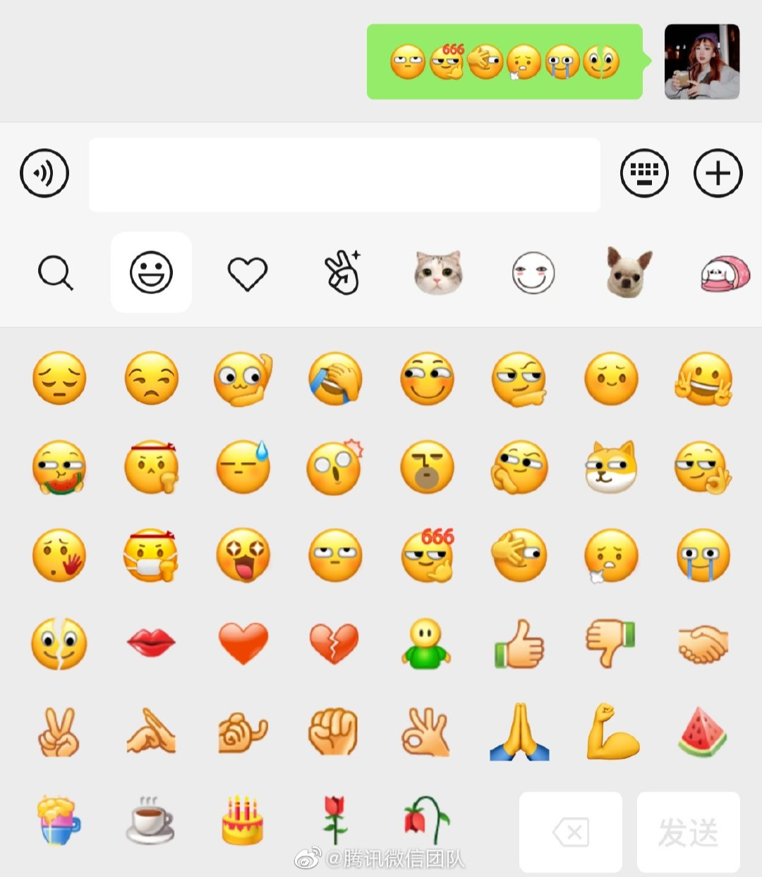 昨日晚,微信官方微博宣布上线了6张新表情,分别是:翻白眼、666、让我看看、叹气、苦涩、裂开。需要注意的是,大部分微信用户的表情面板还未更新这批新表情。用户可以在输入框中输入方括号[] +上面的词语,发送完毕后即可看到新的表情图案。