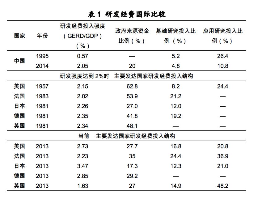 2005年,国家中长期科技发展规划战略研究专题报告指出:我国政府来源研发经费占全社会研发经费投入的比例,到 2010年逐步提高到40%左右,2011-2020年稳定在40%左右。2006年国家中长期规划实施以后,政府来源研发经费投入比例不升反降,2014年仅为20%,与主要发达国家历史同期和当前水平相比均严重偏低(参见表1)。