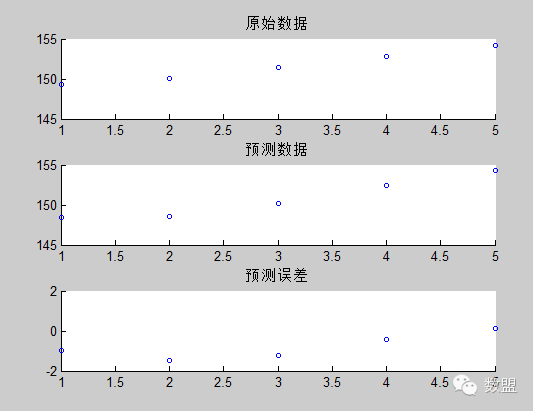 function testKF%% clc close all%%%data = load('D:\\a.txt');%data = [149.360 , 150.06, 151.44, 152.81,154.19,157.72,157.47,159.33,153.66];data = [149.360 , 150.06, 151.44, 152.81,154.19 ,157.72];[predData , DataX] = KF(data'); error = DataX(1,:) - data;i = 1:length(data); figure subplot 311scatter(i,data,3),title('原始数据') subplot 312scatter(i,DataX(1,:),3),title('预测数据') subplot 313scatter(i,error,3),title('预测误差') predData(1)%{scatter(i,error,3); figure scatter(i,data,3) figure scatter(i,predData(1,:),3)%}end