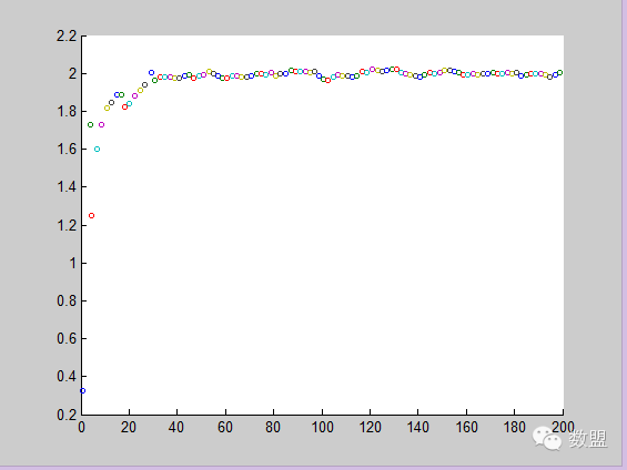 在代码中,我们设定x的变化是 1:2:200,则速度就是2,可以由上图看到,值经过几次迭代,速度就基本上在 2 附近摆动,摆动的原因是我们加入了噪声。