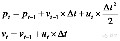 则我们可以得到,由t-1 时刻到 t 时刻,位置以及速度的转换如下:
