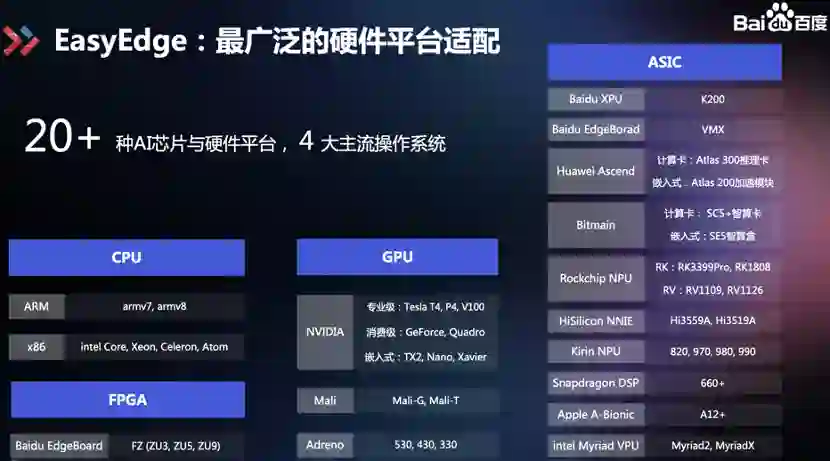 具体到推理芯片上面,EasyEdge支持了很多市面上常见的硬件,除了常见的CPU、GPU以及前面提到的新支持的芯片,同时还支持英伟达Jetson系列、比特大陆、海思NNIE系列、Intel VPU、主流手机上的NPU、GPU等芯片,以及百度自研的EdgeBoard系列边缘AI计算盒。嵌入式设备、ARM CPU,那都不是事。而且,在未来,EasyEdge还会不断适配更多的AI芯片、加速卡、边缘计算盒,持续为开发者降低端侧模型适配迁移的难度。